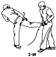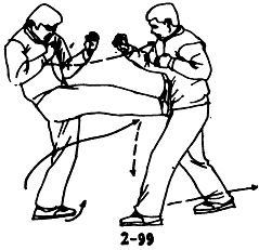 Практические действия: противник напал на вас, пытаясь нанести удар в голову. Выполните уход влево, левым предплечьем отбейте вправо удар противника, а правой ногой нанесите удар пяткой в пах или живот противника, (см.: рис. 2-99).