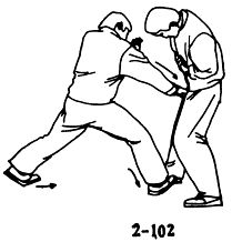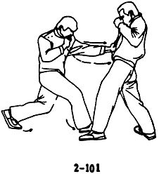 Практические действия: продолжая контратаку левой рукой атакуйте противника в среднюю часть корпуса, то есть в подложку или по ребрам. Правый кулак быстро подтяните назад в положение перед шеей, (см.: рис. 2-101).