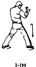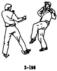 Описание движений: противник обеими руками захватил вашу правую руку. Быстро шагните вперед левой ногой и поставьте левую ступню с внутренней стороны левой ступни противника, повернитесь вправо на 90°. Одновременно, надавливая левой рукой вниз, зажмите сзади шею противника между большим пальцем и основанием указательного пальца левой руки. Большим пальцем нажимайте на точку тяньчжусюэ с правой стороны шеи противника, а средним и указательным — на аналогичную сторону слева. С силой нажимайте на точки и давите левой рукой вниз. Подобный прием можно провести со всеми точками, расположенными на задней стороне шеи (см. рис. 2-202, 2-203).