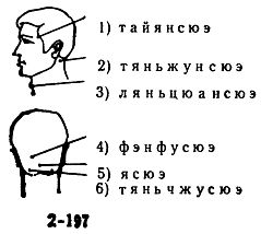 Расположение: точки находятся с задней стороны шеи, т. е. по обе стороны от точки ямэньсюэ, ниже точек юйчжэнчсюэ, по одной справа и слева (рис. 2-197). На эти точки можно нажимать пальцами рук. При этом в лучшем случае происходит немедленное падение, в тяжелом — наступает угроза жизни.