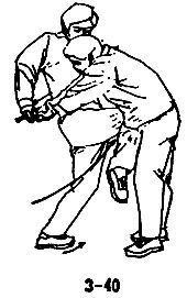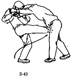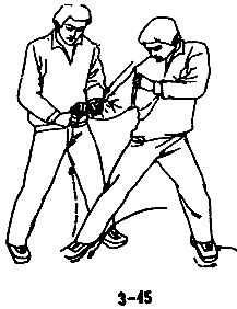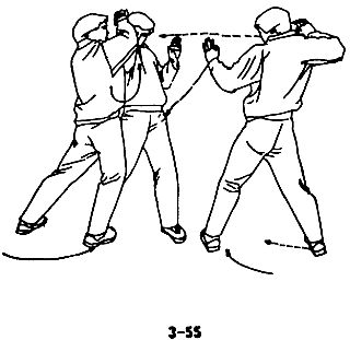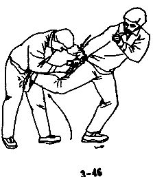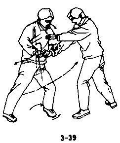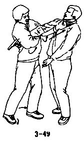 В случае, когда бандит, держа длинную палку обеими руками, идет на вас, делая рубящий мах, необходимо до следующего маха противника быстро приблизиться к нему, левой рукой придержать его руку так, чтобы он не смог сделать мах, вслед за движением вперед правым кулаком нанести снизу резкий удар в живот противника, затем немедленно левой рукой ткнуть его в горло (см. рис. 3-63, 3-64, 3-65).