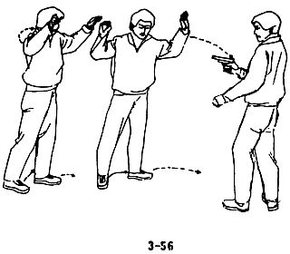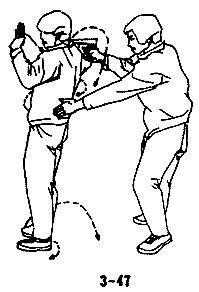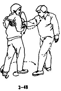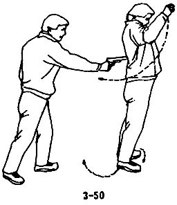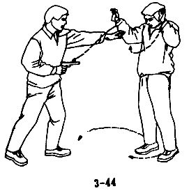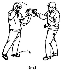 В случае, когда противник держит пистолет в правой руке и направляет дуло вам в затылок, обороняющийся должен подчиниться и поднять руки вверх, улучив момент, неожиданно развернуться вправо верхней частью тела, согнутой в локте правой рукой одновременно с поворотом тела вправо выполнить защитное движение правым предплечьем наружу, правой рукой зажать руку противника, левой ногой вместе с поворотом туловища шагнуть вперед, пронеся ее мимо внутренней стороны правой стопы, повернуться вправо на 180°, пропустить левую руку под правую руку противника, нанести ему удар спереди в горло, одновременно плечом левой руки поднять правый локоть противника так, чтобы он выпрямился, и немедленно надавить своей правой подмышкой вниз на зажатое предплечье противника, правой рукой поднять и сковать локоть противника и разоружить его (см. рис. 3-47,3-48,3-49).