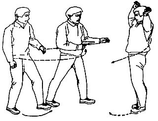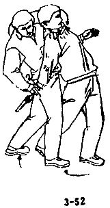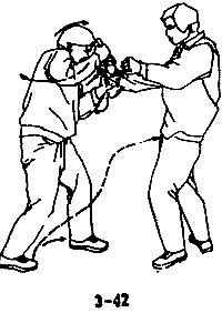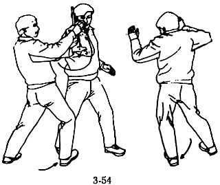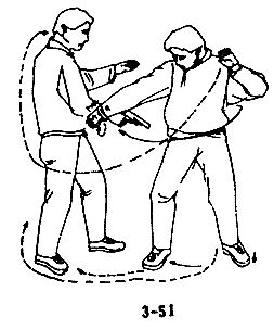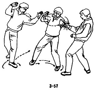 Напарнику быстро подойти сзади, просунуть через плечо правую руку, предплечьем зажать горло противника, вдвоем сковать его (см. рис. 3-56, 3-57, 3-58, 3-59).