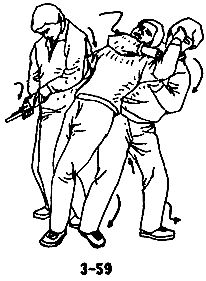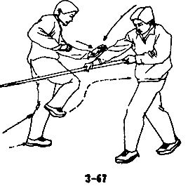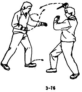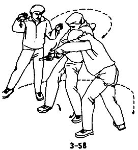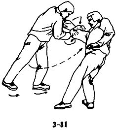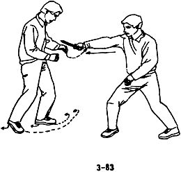 В случае, когда противник с кинжалом в руке приближается к вам, чтобы нанести прямой удар, следует уклониться в сторону, левой ногой сделать шаг влево и вперед, одновременно левой рукой вслед за уклоном движением слева направо и наружу захватить запястье руки противника с кинжалом, немедленно сделать правой ногой шаг вперед, развернуться телом влево на 180°, правую ступню при развороте поставить на шаг влево вперед, левой рукой вслед за разворотом, крепко держа запястье противника, поворачивать его вправо и тянуть вперед, левым плечом подпереть правую руку противника вверх, захватом выполнить рычаг руки противника и разоружить его, одновременно левым локтем нанести резкий удар по ребрам противника (см. рис. 3-83,3-84, 3-85).