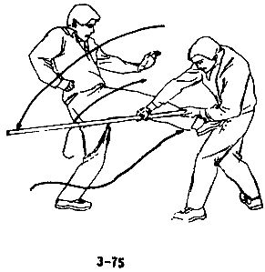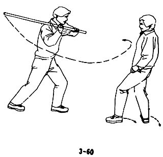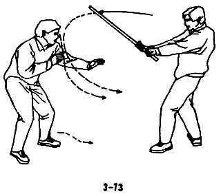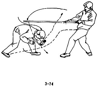 В случае, когда преступник, согнувшись в поясе, совершает махи в горизонтальной плоскости длинной палкой, следует податься вперед, согнуть колени и опустить голову, согнуть спину и присесть, таким образом уклониться от палки противника, воспользовавшись моментом, когда длинная палка уже прошла над вашей головой, следует быстро податься вперед и ногой нанести противнику резкий удар в пах (рис. 3-73, 3-74, 3-75).