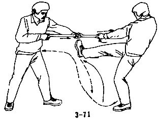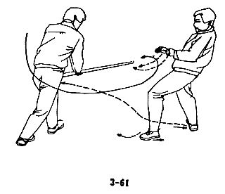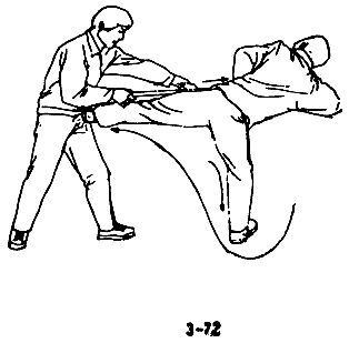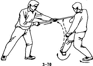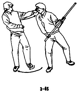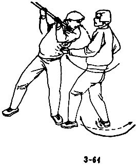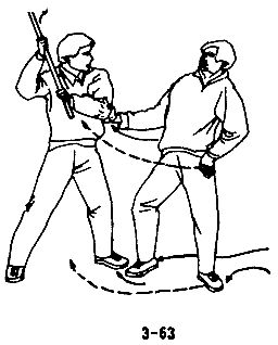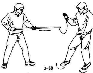 В случае, когда преступник внезапно делает длинной палкой колющий выпад, следует быстро повернуться боком и уклониться от него; правой рукой схватить палку, воспользовавшись благоприятным моментом, потянуть ее вперед, одновременно правой ногой нанести удар по ближайшей к вам держащей палку руке противника, затем немедленно выйти вперед и нанести удар левой пяткой в колено или пах противника (см. рис. 3-69, 3-70, 3-71, 3-72).