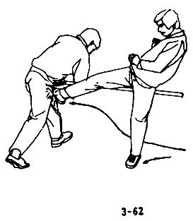 В случае, когда противник, пригнувшись, приближается, держа кинжал лезвием вверх, с целью нанести снизу вверх косой удар, следует быстро отступить на полшага, перенести центр тяжести тела назад и внезапно нанести противнику удар левой ногой в запястье правой руки, немедленно податься верхней частью корпуса вперед, обеими руками схватить запястье правой руки противника и правой ногой нанести ему удар в пах (см. рис. 3-89, 3-90, 3-91).