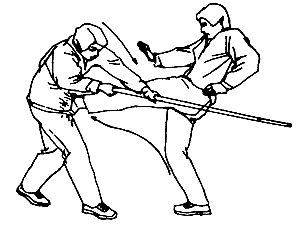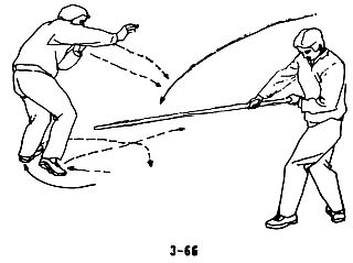 Требования: поворачиваться боком и уклоняться от удара следует быстро, необходимо точно схватить палку, воспользоваться инерцией тычка и потянуть палку на себя, бить ногой быстро и точно;