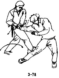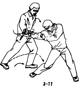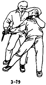 В случае, когда противник с кинжалом в правой руке с правой ноги идет вперед, чтобы нанести вам удар кинжалом сверху вниз в голову, необходимо быстро уклониться, левой ногой сделать шаг влево — вперед, уклониться влево, оказаться таким образом сзади сбоку от противника, правой рукой вместе с уклоном в сторону и выходом вперед нанести удар раскрытой ладонью сверху вниз — вправо в сторону и тут же схватить запястье правой руки противника, вслед за движением вперед левую руку завести через плечо противника и сгибом локтевого сустава резко и сильно захватить его горло. Сковать противника, одновременно правой ногой нанести ему резкий удар в левое колено так, чтобы противник присел (см. рис. 3-76, 3-77, 3-78, 3-79).