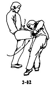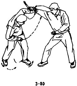 В случае, когда противник с кинжалом в правой руке наносит вам сверху вниз косой удар в голову или плечо, следует быстро увернуться, сделать левой ногой шаг вперед, движением левой руки снизу—вверх—вправо отвести запястье правой руки противника, немедленно просунуть правую руку под одноименную руку противника, захватить запястье и потянуть локтевой сустав, левой рукой придавить запястье влево и вниз так, чтобы заломить правую руку противника, одновременно правым коленом нанести противнику вперед и вверх резкий удар в пах. (См.: рис. 3-80, 3-81, 3-82).
