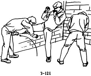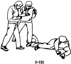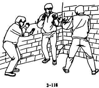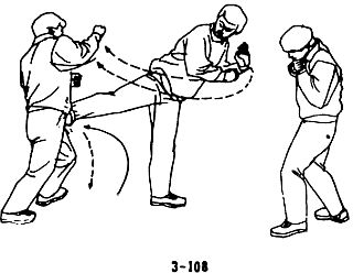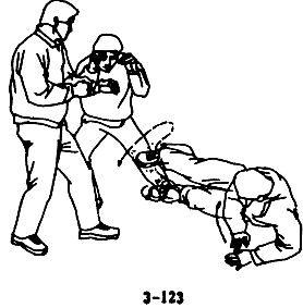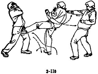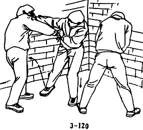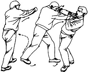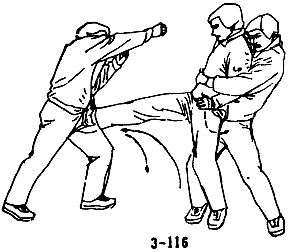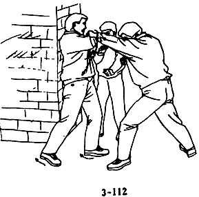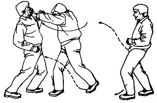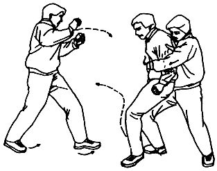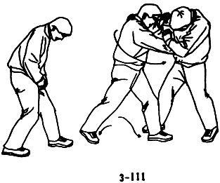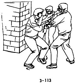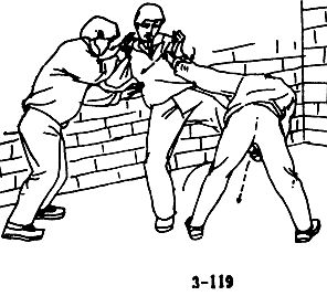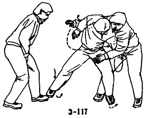 В случае, когда нападающий А сзади обхватывает вас вместе с руками, а нападающий Б нападает спереди, размахивая кулаками, следует быстро нанести нападающему Б удр ногой в пах, одновременно правой рукой, вытянутой назад назад и вниз, нанести нападающему А удар раскрытыми пальцами в пах и заставить противника ослабить руки, немедленно резким усилием развернуться телом вправо, выставить согнутый локоть правой руки, кулаком левой руки с поворотом тела нанести нападающему А прямой удар в живот и освободиться (см. рис. 3-115, 3-116, 3-117).