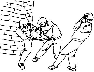 В случае, когда вы столкнулись с двумя преступниками и оттеснены ими в угол, следует согнуть обе руки в локтях, чтобы прикрыть грудь, использовать тактику оборонительной контратаки, левой рукой следует блокировать прямые удары кулаком нападающего А, одновременно нанести нападающему А удар ногой в пах, немедленно ладонью правой руки с растопыренными пальцами сильным ударом цапнуть нападающего Б в лицо и глаза и правой ногой нанести нападающему Б удар стопы в пах (см. рис. 3-118, 3-119, 3-120, 3-121).