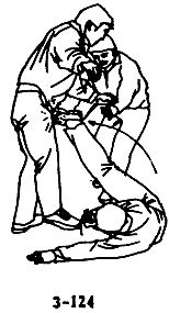 В случае, когда преступники внезапно сбивают вас подножкой с ног, следует падать инициативно, согнуть колени и локти, чтобы защитить легко ранимые части тела, упасть набок. В тот момент, когда преступники, воспользовавшись благоприятной для себя ситуацией, приблизятся для атаки, левой стопой зацепить стопу нападающего А, а правой стопой нанести ему удар в коленный сустав, одновременно согнуть локти для защиты головы, немедленно воспользоваться благоприятным моментом, вобрать живот, нанести нападающему Б удар стопой в низ живота и пах и встать на ноги (см, рис. 3-122, 3-123, 3-124).