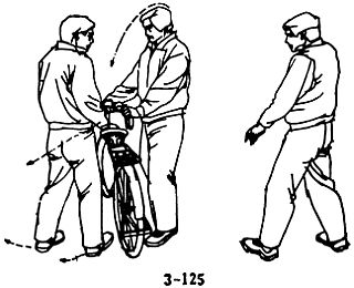 При нападении на вас во время езды на велосипеде следует быстро соскочить с велосипеда и прикрыться им от нападающих, поддерживать дистанцию, внезапно сделать шаг назад, схватить нападающего А и потащить его назад и вниз, заставить его споткнуться о велосипед, свалить его, одновременно нанести нападающему А удар правой ногой в голову, приблизиться к нападающему Б, правым кулаком нанести ему удар согнутыми вторыми суставами сжатых пальцев в горло, немедленно атаковать его же правой ногой в пах (см. рис. 3-125, 3-126, 3-127, 3-128).