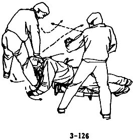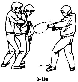 В случае, когда преступник А сзади проводит захват вашей шеи, а преступник Б нападает спереди, чтобы завладеть сумкой, следует быстро опустить ци и напрячь горло, захватить предплечье бандита А и потянуть вниз, ослабить давление на шею, правой ногой нанести приближающемуся спереди бандиту Б удар в пах, немедленно отведя левую руку назад, схватить бандита А за пах и заставить его ослабить руку, воспользовавшись благоприятным моментом, ударить его подошвой стопы назад в пах, развернуться корпусом вправо и непрерывно контратаковать (см. рис. 3-143, 3-144, 3-145, 3-146).