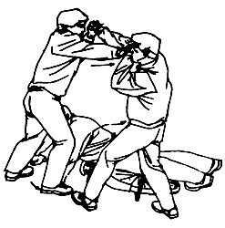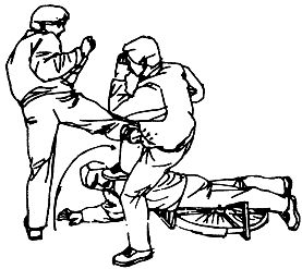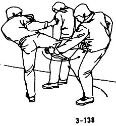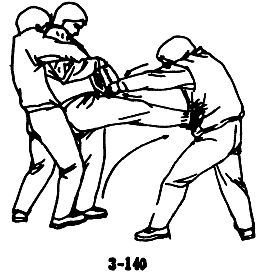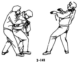 В случае, когда преступник А внезапно захватывает вас за туловище сзади вместе с руками, преступник Б приближается к вам с целью отнять сумку, необходимо быстро опустить центр тяжести тела, осесть вниз, неожиданно нанести нападающему спереди преступнику Б правой ногой удар в низ живота, немедленно вобрать живот и, опуская правую ногу, резко нанести ею топающий удар вниз, в подъем стоящей сзади ноги нападающего А, одновременно левой рукой схватить его ниже живота и вынудить ослабить руки, правым локтем нанести нападающему сзади А удар в голову и выйти из трудного положения (см. рис. 3-139, 3-140, 3-141, 3-142).