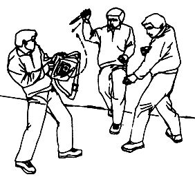 В случае, когда грабители преграждают дорогу и нападающий А с кинжалом приближается с намерением завладеть сумкой, следует обеими руками схватить сумку, внезапно нанести ею встречный удар в запястье правой руки вооруженного нападающего А, отбить лезвие кинжала, немедленно нанести ему же удар правой ногой в пах, сделать шаг вперед, правую руку сжать в кулак и нанести им удар сверху по глазам противника, затем немедленно левой ногой ударить назад нападающего Б в пах, развернуться туловищем вправо и нанести ему же удар правым кулаком наотмашь слева направо в голову (см. рис. 3-135, 3-136, 3-137, 3-138).