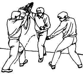 Требования: наносить встречный удар сумкой следует внезапно и быстро, пинать в пах и бить по глазам — точно, будьте очень осторожны относительно атаки кинжалом. Удар подошвой стопы назад, разворот туловищем, удар кулаком наотмашь следует выполнять быстро, координировать работу рук и ног.