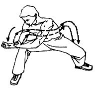 Тренировочный инвентарь: приготовьте горшок (кувшин) подходящего веса и размера, расставьте ноги, слегка согните колени и присядьте в позе мабу («скачущего всадника»), держите кувшин всеми пальцами вытянутой правой руки и непрерывно две-четыре минуты медленно качайте кувшином вниз — вверх, меняя руки, проделайте упражнение 5 раз (см. рис. 4–5).