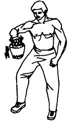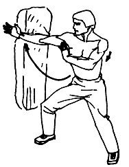 Методика тренировок: «укрыть» грудь, напрячь спину, встать спиной к стенке так, чтобы спина была от нее примерно в 30 см, сделать вдох, опустить ц и, затем немедленно внезапно с силой удариться назад так, чтобы спина налетела на стенку, или повернуться телом влево или вправо и удариться в стену левым или правым плечом, сочетать это с мысленным сосредоточением внимания на некой точке приложения силы, в которой плечо соприкасается со стеной, или попросить напарника потренироваться в нанесении ударов набивным мячом (см. рис. 4-10).