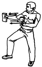Методика тренировок: расставить ноги, согнуть колени, присесть в позе мабу, взять в правую руку палку, правое плечо подать вперед и внутрь, правую руку повернуть внутрь и подвести к левому боку, опустить ци и напрячь живот, Мышцы левого плечевого сустава и спины напрячь. Палкой в правой руке последовательно наносить удары по левому плечу и спине, повторить упражнение 50 раз. Затем взять палку в левую руку, правое плечо подать вперед и внутрь, правую руку повернуть внутрь и приложить к правому боку, палкой в левой руке последовательно наносить удары по левому плечу и спине, повторить упражнение 50 раз (см. рис. 4-11).
