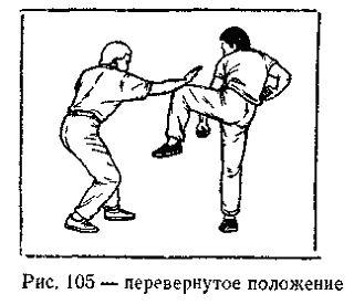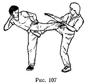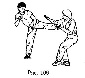Данное движение можно применять и для тактического обмана противника. Маневр заключается в следующем: защищающийся намеренно показывает свою неустойчивость в момент разворота и невозможность контратаковать левой ногой (рис. 102). В момент движения противника вперед, мгновенно перенося вес тела на левую ногу, контратакует его правой ногой (рис. 104, 107 и 108).