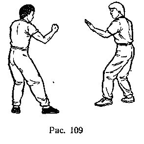 Атакующий (темные волосы) наносит прямой удар правой рукой в корпус с шагом вперед в переднюю позицию. Защищающийся из левосторонней задней позиции (рис. 109),