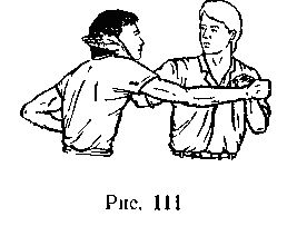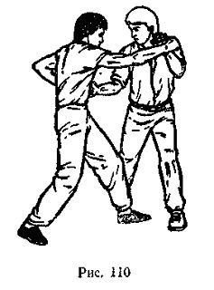 Выставленная вперед левая рука защищающегося блокирует атаку противника, отталкивая предплечьем бьющую руку от себя, а кистью ограничивая движение руки противника вверх (рис. 111).