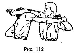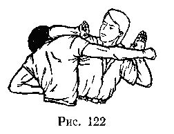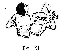 Далее правая рука продолжает движение по кругу, двигаясь вместе с корпусом против часовой стрелки (рис. 121). При этом кисти обеих рук защищающегося зажимают руку нападающего, ограничивая его отход назад.
