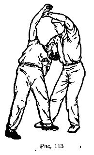 Причем воздействие следует производить «накатывающим» движением правой руки. Затем вновь происходит смена плоскости воздействия правой руки — защищающийся прижимает голову противника к себе, ставя нападающего в положение, совсем не удобное для атаки. При этом левая рука все время защищает верхний сектор, блокируя правую руку противника, т. е контакт левой руки защищающегося и правой нападающего остается постоянным (рис. 113)