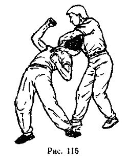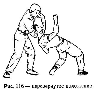 рука защищающегося, не прерывая своего движения и следуя за движением противника (а это направление полностью совпадает с траекторией движения правой руки защищающегося, и тем самым усиливается эффект воздействия) скручивает еще больше его голову (рис. 114 — перевернуто).Не теряя контакта с телом противника, правая рука накладывается на его корпус, надавливая на него сверху, что совсем выводит противника из равновесного положения (рис. 115). Скрутка головы продолжается уже левой рукой, поскольку противник руками достать защищающегося в таком положении не имеет возможности (рис. 115).
