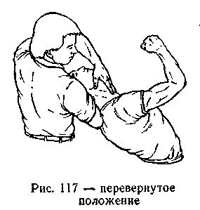 Затем следует быстрая смена плоскости на вертикальную и голова нападающего оказывается зажатой плечом и предплечьем защищающегося (рис 123 — перевернуто).