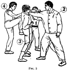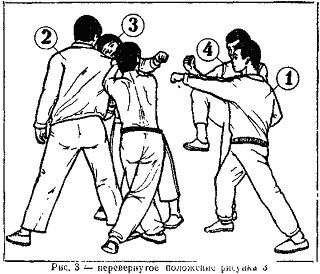 Таким образом, обороняющийся частично нейтрализовал двух своих противников и уже сам перешел к наступательным действиям, заставляя нападающего № 4 обороняться от удара левой рукой изнутри наружу с длинным выпадом в переднюю позицию. Этим выпадом защищающийся выполнил еще одну, уже третью, задачу — сорвал атаку противника № 1, поскольку тому пришлось резко сменить ее направление (а он двигался за обороняющимся все время в одном направлении).