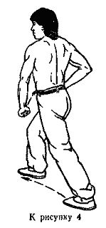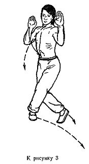 Защищающийся переходит в левую переднюю позицию, отводя правую ногу по дуге назад и поворачиваясь лицом к противнику № 4. Используя локоть левой руки как центр вращения, защищающийся блокирует левую ногу противника № 4 (рис. 9).