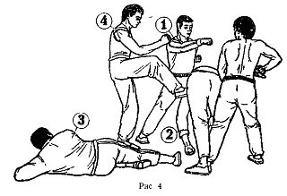 Итак, противник № 1 тоже частично выведен из строя. Однако противник № 4 успевает восстановить равновесие, оценить ситуацию и вновь готов атаковать как ногой, так и рукой.