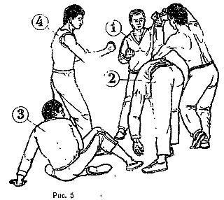 Следует обратить внимание на положение рук защищающегося при его переходе в левую позицию (рис. 5): продолжая контролировать плечо противника № 2 левой рукой, правой рукой он делает верхний блок, удерживая захваченную руку противника № 2 в вертикальном положении, чем достигается возможность успешно противостоять сразу двум нападающим (противникам №№ 1 и 4). Осуществляя болевое воздействие на плечо и запястье противника № 2, защищающийся полностью контролирует его положение.