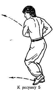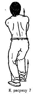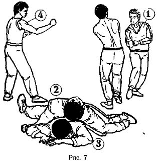 Защищающийся подтягивает правую ногу к левой, создавая видимость дальнейшего движения за потерявшим равновесие противником № 4, который инстинктивно отступает назад, увеличивая дистанцию между собой и защищающимся. При этом защищающийся занимает сгруппированную позицию (рис. 7), руки скрещиваются, закрывая бока, низ живота, грудь и подбородок.