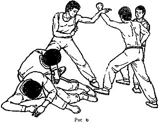 Снова, удерживая травмированного противника № 2, защищающийся переходит в левую переднюю позицию и атакует противника № 4, который еще не успел после своей атаки ногой поставить ее на землю и старается вывести его из равновесия (рис. 6).