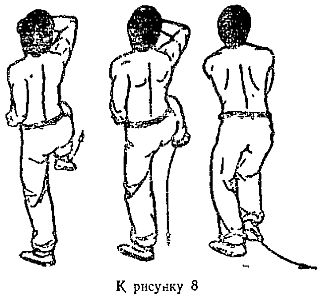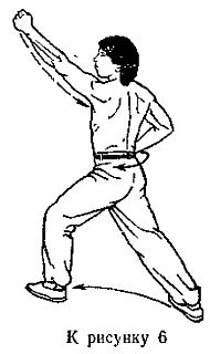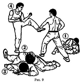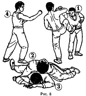 ноги к левой создает впечатление передвижения, хотя защищающийся только немного смещает свой центр тяжести на левую ногу. Естественно, противник № 1 бросается в атаку, сменив направление движения. В этот момент он думает только о том, чтобы не выпустить защищающегося из зоны досягаемости и мало заботится о своей защите. Защищающийся, используя эту тактическую и психологическую уловку, атакует неподготовленного к защите противника № 1 ударом ногой в пах, одновременно делая блокирующее движение правой рукой вверх — на случай возможной атаки или в качестве страховки (рис. 8).После удара ногой защищающийся сразу же возвращается в предыдущую позицию, вес на левой ноге, руки скрещены перед грудью, правая нога подтянута к левой, касаясь пальцами пола (рис. 7).