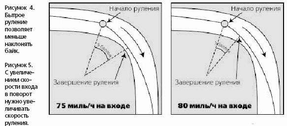 Но вот что странно – в неприятных ситуациях "уличные" водители проходят поворот с большим углом наклона, чем это необходимо при данной скорости. Да и многие гонщики делают то же самое. Они как бы выбирают кредит наклона. Есть возможность наклониться или нет (подножки или глушитель уже высекают искры), они все равно стараются завалить байк еще больше. Я часто видел, как гонщики царапают части мотоцикла в поворотах, которые можно пройти на 5-10 миль в час быстрее и при этом с меньшим углом наклона. Чем круче угол – тем лучше? Или вы предпочтете проходить поворот быстрее с меньшим углом?