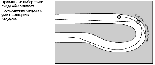 Вот вам еще один пример, подчеркивающий важность выбора точки входа. Это прохождение поворота с уменьшающимся радиусом. При ранней точке входа вы не сможете правильно принять ни одно из 11 решений, перечисленных выше.