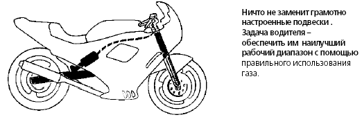 усредненные условия, для лучшего прохождения "любимых" поворотов водителя.Лучший инструмент для настройки подвесок – ручка газа. На любом мотоцикле именно грамотное применение ручки газа позволяет идеально контролировать развесовку в повороте. Очевидно, слишком сильное открытие перемещает вес назад, закрытие – вперед. При весе системы водитель-мотоцикл в 600 фунтов, вы легким движением правой руки перебрасываете 150 фунтов спереди назад и наоборот. Управление газом – ключ к настройке подвесок.