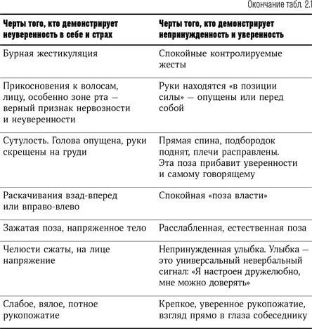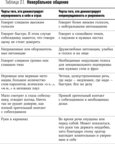 Для начала вам следует овладеть невербальными методами коммуникации так, чтобы контролировать вашего потенциального клиента, то, что он будет сознательно видеть и слышать и подсознательно воспринимать (табл. 2.1). В числе этих воздействующих факторов: