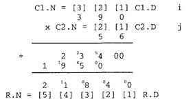 первый взгляд, кажется, что необходимо ввести переменное количество промежуточных массивов (в зависимости от количества цифр второго сомножителя) для запоминания продукта умножения первого сомножителя на очередную цифру второго сомножителя. Однако внимательный анализ структур данных позволяет найти иной способ выполнения расчетов. При этом способе сначала обнуляется результат. Далее результат последовательно увеличивается на сдвинутый на разряд влево продукт умножения первого сомножителя на очередную цифру второго сомножителя. Переоформляем наглядное изображение процесса преобразования входных данных обобщающего теста.На странице 4 или следующей иногда полезно поместить описание алгоритма в обыденном неструктурированном понимании.