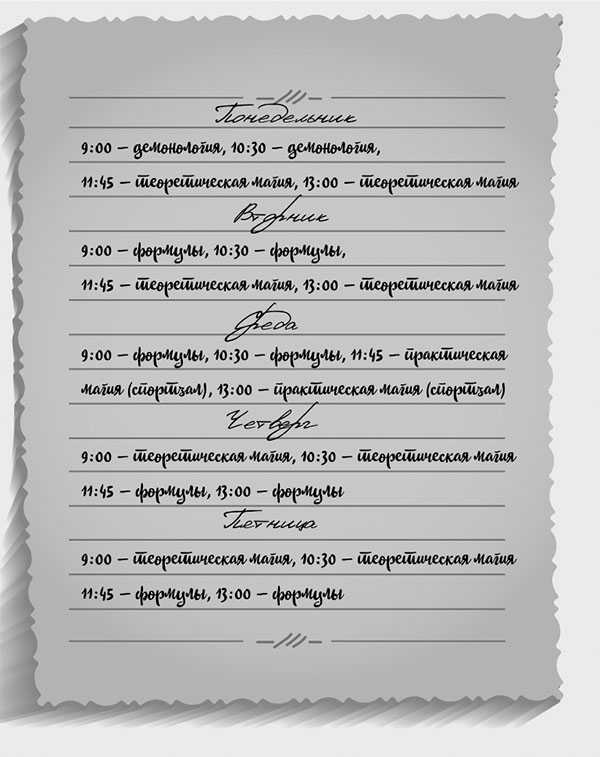 Подгоняемая мыслями о том, что чем прилежнее она будет учиться, тем лучшей охотницей станет, девушка ускорила шаг и обогнала сокурсников. В холл она вышла первой, а по лестнице буквально взлетела, стремясь поскорее оказаться в своей комнате. Лишь оказавшись за закрытой дверью, Габриэль смогла расслабиться. Она села на кровать и взяла в руки расписание занятий. Дисциплин оказалось немного, но изо дня в день они повторялись, так что можно было не сомневаться – обучение будет максимально интенсивным. Например, завтра студентов ждали две демонологии и два занятия по теоретической магии. Габриэль углубилась в изучение расписания.