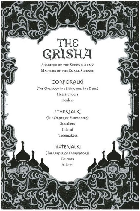 камина и играть в карты, попивая квас. Старшие дети, запертые внутри дома, от скуки устраивали постоянные склоки и драки. Потому мальчик и девочка прятались в заброшенных комнатах поместья, устраивая театральные постановки для мышей и пытаясь тем самым согреться.В тот день, когда приехали экзаменаторы Гриши, дети заняли место у окна одной из пыльных спален на втором этаже, надеясь хоть мельком посмотреть на почтовую карету. Вместо этого их глазам предстали сани, запряженные тройкой черных лошадей, как раз проезжающие через ворота из белого камня. Дети молча наблюдали, как сани скользят по заснеженному холму к главному входу дома князя. Чуть позже из них вышли три фигуры в элегантных меховых шапках и тяжелых шерстяных кафтанах: красном, синем и фиолетовом.