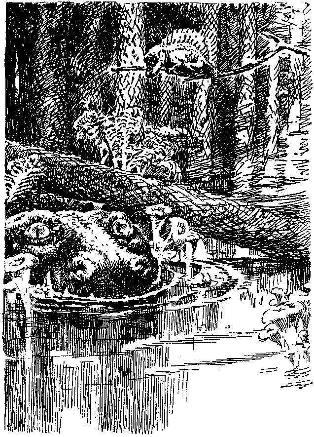 черную воду. Вверху каждое дерево разделялось на две расходившиеся под углом толстые ветки, исчезавшие в густой тени плотно стеснившихся крон. Толстый чешуйчатый ствол лежал поперек воды, упав на небольшой бугорок, выступавший налево. Бугорок зарос странными растениями, похожими на грибы, высокие и узкие фиолетовые бокалы которых усеивали мокрую красную почву. Мясистые отвороты чашечек каждого гриба показывали маслянистую желтую внутренность. За бугорком, над резко изогнутыми стеблями без листьев, виднелся просвет, заполненный вдали мутным, слабо розовеющим туманом. Впереди из тумана торчал какой-то искривленный голый сук, а на нем съежилось, втянув голову, непонятное живое существо.Всматриваясь в изображение, Никитин вздрогнул — из-под фиолетовых грибов, скрывая тело в их гуще, выступала широкая параболическая голова, покрытая слизистой лиловато-бурой кожей. Огромные выпуклые глаза смотрели прямо на Никитина, бессмысленно, непреклонно и злобно. Крупные зубы выступали из нижней челюсти, обнажаясь во впадинах края морды. Справа лился, освещая всю картину, какой-то тусклый жемчужный свет. Освещенный воздух казался черноватым, словно через закопченное, но прозрачное стекло…