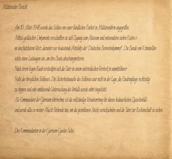 — Kein Problem[2], — ответил ему тот, внимательно вглядываясь в заметно выцветший текст. — Воэнный отчет. 10 марта 1945 года замок подвэргся нападению вражэского подразделения в военной форме. Используя поддэльные документы, они получили доступ в музей и похитили семь коробок ценностэй, в том числе четыре важных артефакта из «Немецкой янтарной палаты». Для перевозки награбленного банда преступников использовала грузовик. После трусливого ограблэния преступники скрылись в подзэмном убежище в непосредственной близости от королевского замка. Охрана замка не смогла вовремя остановить злоумышленников, и нэмэдленно было начато полное расследование инцидента. Как командир гарнизона я беру на себя полную ответственность за этот досадный инцидент и сделаю все, что в моих силах, чтобы вернуть украденное и привлечь виновных к ответственности. Командир гарнизона, Густав Шольц.