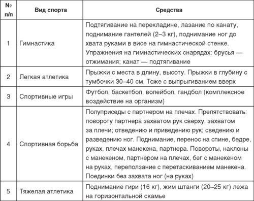 Занимаясь повышением силовой подготовленности дзюдоистов 12–14 лет, следует по возможности исключить статические упражнения и напряжения организма, связанные с натуживанием (задержкой дыхания). В тренировочные уроки необходимо включать спортивные игры с элементами взаимодействий (баскетбол, гандбол, футбол) для повышения уровня скоростно-силовых способностей. Силовые способности дзюдоистов 12-14-летнего возраста также эффективно развиваются под воздействием средств из других видов спорта (табл. 20).