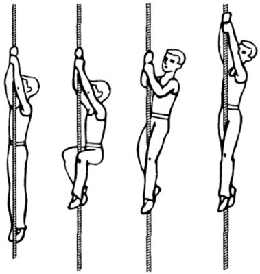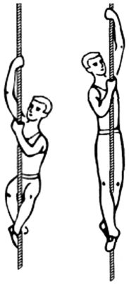 а) Лазание по канату в 3 приема начинают из и. п. — вис стоя, хват прямыми руками выше головы (рис. 12). Первый прием: согнуть ноги вперед, обхватить ими канат, перейти в вис присев. Второй прием: разогнуть ноги вперед, подтянуться на руках, прийти в вис стоя на согнутых руках. Третий прием: перехватить руки поочередно, перейти в вис стоя.